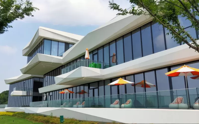 Bức tường Rèm kính, kết hợp khéo léo với lưới tản nhiệt trang trí, thể hiện Nguyên Tắc "ít hơn", tạo ra một bầu không khí sắc nét và rõ ràng, nhẹ nhàng và thoáng mát làm mờ ranh giới của tòa nhà, tỏa sáng và vui vẻ.