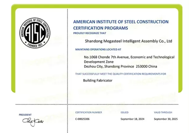 Shandong megasteel Intelligent Assembly đã Cập nhật chứng nhận aisc. với chất lượng vượt trội, chúng tôi đã đạt được sự phát triển ổn định và giành được sự công nhận cao từ thị trường và ngành công nghiệp.